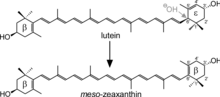 meso-Zeaxanthin may be generated from other carotenoids consumed in the diet, as carotenoids are known to convert into different carotenoids for functional reasons. For example, it has been suggested that meso-zeaxanthin of trout integuments is derived from astaxanthin,[10] and meso-zeaxanthin in primates (macula lutea) is derived (at least in part) from lutein.[5][6]