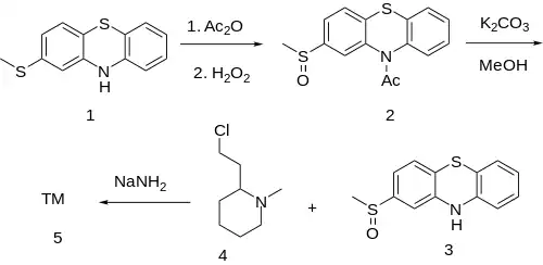 2-Methylthiophenothiazine [7643-08-5] (1) is treated with acetic anhydride] to give the protected amide, ie 10-acetyl-2-methylthiophenothiazine, CID:69367526. Oxidation of this by means of hydrogen peroxide and removal of the acetyl protecting group with potassium carbonate in methanol solution gives 2-methylsulfonylphenothiazine [23503-68-6] (3). Introduction of the sidechain by alkylation with 2-(2-chlorethyl)-1-methylpiperidine [50846-01-0] (6) in the presence of sodamide, afforded the desired mesoridazine (5).