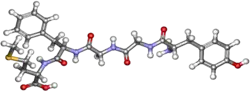 Met-enkephalin, also known as metenkefalin (INN), sometimes referred to as opioid growth factor (OGF),[1] is a naturally occurring, endogenous opioid peptide that has opioid effects of a relatively short duration. It is one of the two forms of enkephalin, the other being leu-enkephalin. The enkephalins are considered to be the primary endogenous ligands of the δ-opioid receptor, due to their high potency and selectivity for the site over the other endogenous opioids.[2]