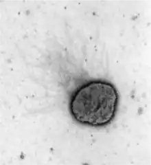 Electron micrograph of Methanococcus maripaludis' showing prominent archaella features and interior body. Courtesy of Dr. Ken F. Jarrell and Shin-Ichi Aizawa. Mag bar of 500nm. | |