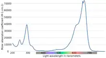 Absorption spectrum of methylene blue, in terms of the molar extinction coefficient (base 10 logarithm). In this dataset a peak absorbance of 1.7 (i.e. 98% of transmitted light absorbed) was observed with 665 nm light passing through 1 cm of 10 micromolar methylene blue solution.