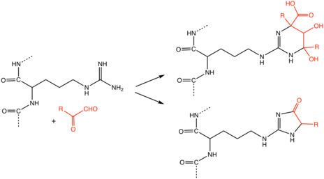Methylglyoxal is involved in the formation of advanced glycation end products (AGEs).[4] In this process, methylglyoxal reacts with free amino groups of lysine and arginine and with thiol groups of cysteine forming AGEs. Histones are also heavily susceptible to modification by methylglyoxal and these modifications are elevated in breast cancer.[9][10]