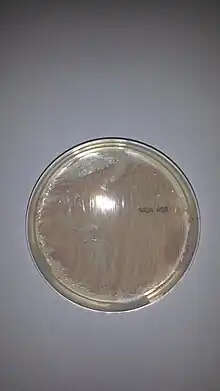 Methylobacterium fujisawaense pink-pigmented bacterial colonies growing on R2A after 5 days of incubation at 30 °C (front view).