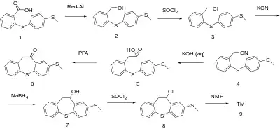The reduction of 2-(4-methylsulfanylphenyl)sulfanylbenzoic acid, CID:2733664 (1) gives [2-(4-methylsulfanylphenyl)sulfanylphenyl]methanol, CID:12853582 (2). Halogenating with thionyl chloride gives 1-(chloromethyl)-2-(4-methylsulfanylphenyl)sulfanylbenzene, CID:12853583 (3). FGI with cyanide gives 2-[2-(4-methylsulfanylphenyl)sulfanylphenyl]acetonitrile, CID:12853584 (4). Alkali hydrolysis of the nitrile to 2-[2-(4-methylsulfanylphenyl)sulfanylphenyl]acetic acid, CID:12383832 (5). PPA cyclization to 3-methylsulfanyl-6H-benzo[b][1]benzothiepin-5-one, CID:827052 (6). The reduction with sodium borohydride gives 3-methylsulfanyl-5,6-dihydrobenzo[b][1]benzothiepin-5-ol, CID:13597048 (7). Halogenating with a second round of thionyl chloride gives 5-chloro-3-methylsulfanyl-5,6-dihydrobenzo[b][1]benzothiepine, CID:12404411. Alkylation with 1-methylpiperazine [109-01-3] completed the synthesis of Metitepine (9).