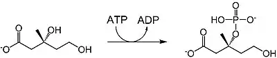 Mevalonate is phosphorylated at the 5-OH position to yield mevalonate-5-phosphate (also called phosphomevalonic acid).