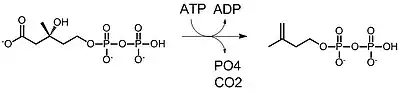 The lower mevalonate pathway which converts (R)-mevalonate into IPP and DMAPP has 3 variants. In eukaryotes, mevalonate is phosphorylated twice in the 5-OH position, then decarboxylated to yield IPP.[4] In some archaea such as Haloferax volcanii, mevalonate is phosphorylated once in the 5-OH position, decarboxylated to yield isopentenyl phosphate (IP), and finally phosphorylated again to yield IPP (Archaeal Mevalonate Pathway I).[5] A third mevalonate pathway variant found in Thermoplasma acidophilum, phosphorylates mevalonate at the 3-OH position followed by phosphorylation at the 5-OH position. The resulting metabolite, mevalonate-3,5-bisphosphate, is decarboxylated to IP, and finally phosphorylated to yield IPP (Archaeal Mevalonate Pathway II).[6][7]