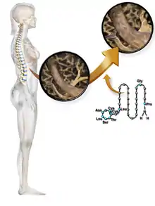 Calcitonin is a polypeptide hormone of 32 amino acids, with a molecular weight of 3454.93 daltons. Its structure comprises a single alpha helix.[38] Alternative splicing of the gene coding for calcitonin produces a distantly related peptide of 37 amino acids, called calcitonin gene-related peptide (CGRP), beta type.[39]