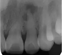 Radiograph (X-ray) showing microdontia. Note also periapical lesion on the maxillary left lateral incisor. | |