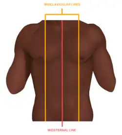 ![]() Surface lines of the anterior thorax. The midsternal line is visible at the center, running vertically. | |