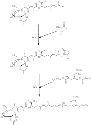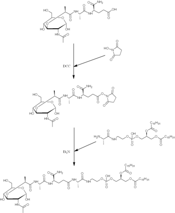 One method of synthesis (shown first) is based on N,N'-dicyclohexylcarbodiimide (DCC) assisted esterification of N-acetylmuramyl-L-alanyl-D-isoglutaminyl-L-alanine with N-hydroxysuccinimide, followed by a condensation with 2-aminoethyl-2,3-dipalmitoylglycerylphosphoric acid in triethylamine (Et3N).[12] A different approach (shown second) uses N-acetylmuramyl-L-alanyl-D-isoglutamine, hydroxysuccinimide and alanyl-2-aminoethyl-2,3-dipalmitoylglycerylphosphoric acid;[13] that is, the alanine is introduced in the second step instead of the first.