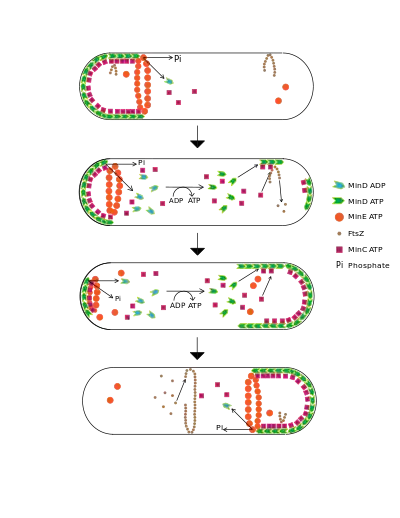 The MinCDE system. MinD-ATP binds to a cell pole, also binds MinC, which prevents the formation of FtsZ polymers. The MinE ring causes hydrolysis of MinD's bound ATP, turning it into ADP and releasing the complex from the membrane. The system oscillates as each pole builds up a concentration of inhibitor that is periodically dismantled.