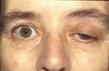 Patient with myasthenia gravis showing typical symptom of eyelid droop