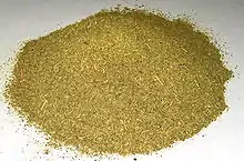Many of the key psychoactive compounds in M. speciosa are indole alkaloids related to mitragynine, which is a tetracyclic relative of the pentacyclic indole alkaloids, yohimbine and voacangine.[10] In particular, mitragynine and 7-hydroxymitragynine (7-HMG) compose significant proportions of the natural products isolable from M. speciosa; e.g., in one study, mitragynine was 12% by weight from Malaysian leaf sources, versus 66% from Thai sources, and 7-hydroxymitragynine constituted ~2% by weight.[10][73] At least 40 other compounds have been isolated from M. speciosa leaves,[28] including ~25 additional alkaloids, including raubasine/ajmalicine (originally isolated from Rauvolfia serpentina), corynantheidine (also found in Corynanthe johimbe),[66] as well as mitraphylline, mitragynine pseudoindoxyl, and rhynchophylline.[74][75]