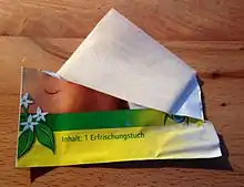A wet wipe, also known as a wet towel, moist towelette, disposable wipe, disinfecting wipe, or a baby wipe (in specific circumstances) is a small to medium-sized moistened piece of plastic[1] or cloth that either comes folded and individually wrapped for convenience or, in the case of dispensers, as a large roll with individual wipes that can be torn off. Wet wipes are used for cleaning purposes like personal hygiene and household cleaning; each is a separate product depending on the chemicals added and medical or office cleaning wipes are not intended for skin hygiene.