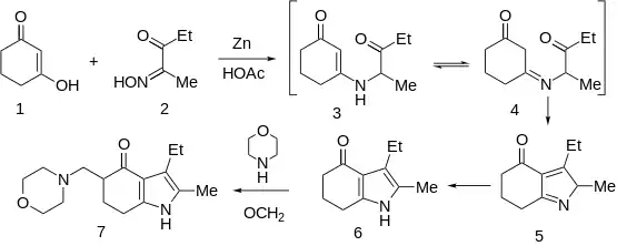 Condensation of oximinoketone 2 (from nitrosation of 3-pentanone), with cyclohexane-1,3-dione (1) in the presence of zinc and acetic acid leads directly to the partly reduced indole derivative 6. The transformation may be rationalized by assuming as the first step, reduction of 2 to the corresponding α-aminoketone. Conjugate addition of the amine to 1 followed by elimination of hydroxide (as water) would give ene-aminoketone 3. This enamine may be assumed to be in tautomeric equilibrium with imine 4. Aldol condensation of the side chain carbonyl group with the doubly activated ring methylene group would then result in cyclization to pyrrole 5; simple tautomeric transformation would then give the observed product. Mannich reaction of 6 with formaldehyde and morpholine gives the tranquilizer molindone (7).