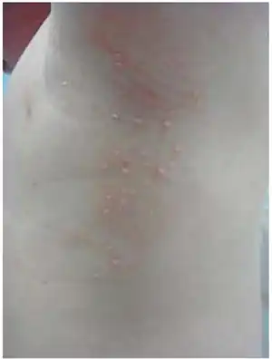 Molluscum dermatitis represents a unique form of id reaction, in which patients may present with localized or widespread eczema surrounding scattered lesions of molluscum contagiosum.[1]: 81