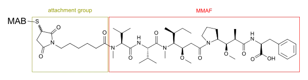 Monomethyl auristatin F is an antimitotic agent which inhibits cell division by blocking the polymerisation of tubulin. It is linked to an antibody with high affinity to structures on cancer cells, causing MMAF to accumulate in such cells.[3]