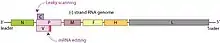 Viral replication is cytoplasmic. Entry into the host cell is achieved by virus attaching to host cell. Replication follows the negative-stranded RNA virus replication model. Negative-stranded RNA virus transcription, using polymerase stuttering, through co-transcriptional RNA editing is the method of transcription. Translation takes place by leaky scanning. The virus exits the host cell by budding. Humans, cattle, dogs, cats, and cetaceans serve as the natural hosts. Infection from this virus takes place in five stages: incubation, prodromal, mucosal, diarrheic, and convalescent.[5][6] Transmission routes are respiratory.[2][3][7][8][9] Morbillivirus are sensitive to high temperatures, sunlight, extreme pH levels, and any chemical that can destroy its outer envelope.[10]