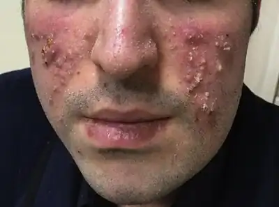 Presentation of multiple pustular and nodulocystic lesions on cheeks and neck