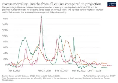 The collaborative network EuroMOMO (European mortality monitoring activity), monitors mortality across 24 European countries in order to detect and measure excess deaths related to seasonal influenza, pandemics, and other public health threats. EuroMOMO is hosted and maintained by the Department of Infectious Disease Epidemiology and Prevention of Copenhagen, Denmark. They offer regular reports (weekly bulletins), graphs and maps showing the present levels of mortality but the network does not publish openly data. Individual partners may decide to share openly some selected national data, like for instance, MoMo-Spain Archived 2022-04-23 at the Wayback Machine. The study centre at the Statens Serum Institut in Copenhagen publishes a weekly situation report and regular scientific articles. Periods of high excess mortality have also been described for the United States.[5]