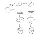 - In unequal cleavage, the first two cell divisions are unequal producing four cells in which one cell is bigger than the other three. This larger cell is specified as the D macromere.[8][9] Unlike equally cleaving spiralians, the D macromere is specified at the four-cell stage during unequal cleavage. Unequal cleavage can occur in two ways. One method involves asymmetric positioning of the cleavage spindle.[9] This occurs when the aster at one pole attaches to the cell membrane, causing it to be much smaller than the aster at the other pole.[8] This results in an unequal cytokinesis, in which both macromeres inherit part of the animal region of the egg, but only the bigger macromere inherits the vegetal region.[8] The second mechanism of unequal cleavage involves the production of an enucleate, membrane bound, cytoplasmic protrusion, called a polar lobe.[8] This polar lobe forms at the vegetal pole during cleavage, and then gets shunted to the D blastomere.[7][8] The polar lobe contains vegetal cytoplasm, which becomes inherited by the future D macromere.[9]