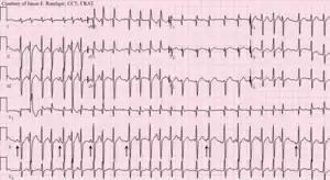 Multifocal (or multiform) atrial tachycardia (MAT) is an abnormal heart rhythm,[2] specifically a type of supraventricular tachycardia, that is particularly common in older people and is associated with exacerbations of chronic obstructive pulmonary disease (COPD). Normally, the heart rate is controlled by a cluster of cells called the sinoatrial node (SA node). When a number of different clusters of cells outside the SA node take over control of the heart rate, and the rate exceeds 100 beats per minute, this is called multifocal atrial tachycardia (if the heart rate is ≤100, this is technically not a tachycardia and it is then termed multifocal atrial rhythm).[3]