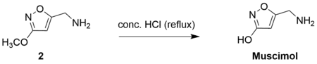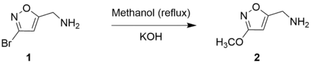 Muscimol was synthesized in 1965 by Gagneux,[30] who utilized a bromo-isoxazole starting material in a two step reaction. 3-bromo-5-aminomethyl-isoxazole (1) was refluxed in a mixture of methanol and potassium hydroxide for 30 hours, resulting in 3-methoxy-5-aminomethyl-isoxazole (2) with a yield of 60%.