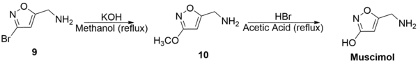(9) was then refluxed with potassium hydroxide in methanol to generate 5-Aminomethyl-3-methoxyisoxazole (10) with a 66% yield. Subsequent reflux of (10) with hydrobromic acid and acetic acid generated muscimol with a yield of 62%. The overall synthetic yield was 30%.[26]