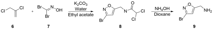 Varasi's synthesis is notable for its inexpensive starting materials and mild conditions. It begins with the combination of 2,3-Dichloro-1-propene (6), potassium bicarbonate, water, and dibromoformaldoxime (7), all dissolved in ethyl acetate. 5-Chloromethyl-3-bromoisoxazole (8) was extracted with an experimental yield of 81%. 5-Aminomethyl-3-bromoisoxazole (9) was formed in 90% yield by the combination of (8) and ammonium hydroxide in dioxane.[26]