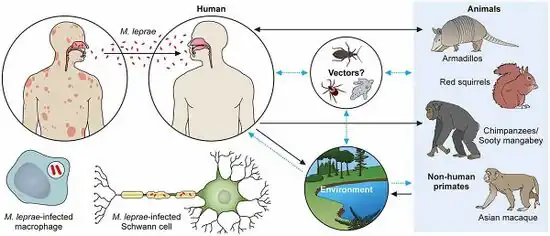 - ↑ Sugawara-Mikami M, Tanigawa K, Kawashima A, Kiriya M, Nakamura Y, Fujiwara Y, Suzuki K (December 2022). "Pathogenicity and virulence of Mycobacterium leprae". Virulence. 13 (1): 1985–2011. doi:10.1080/21505594.2022.2141987. PMID 36326715.