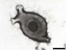 Electron micrograph of Mycoplasma gallisepticum, scale bar 140 nm