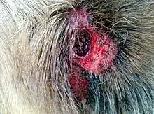 Myiasis, also known as fly strike, is a parasitic infestation by fly larvae (maggots).[2] While there are a number of forms, most commonly the skin or a wound is involved.[2] Symptoms may include pain, itchiness, and the feeling of movement.[2] Complications may include a bacterial infection or scarring.[2]
