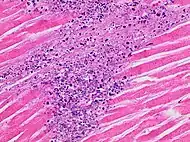 Although earlier changes can be discerned using electron microscopy, one of the earliest changes under a normal microscope are so-called wavy fibers.[21] Subsequently, the myocyte cytoplasm becomes more eosinophilic (pink) and the cells lose their transversal striations, with typical changes and eventually loss of the cell nucleus.[22] The interstitium at the margin of the infarcted area is initially infiltrated with neutrophils, then with lymphocytes and macrophages, who phagocytose ("eat") the myocyte debris. The necrotic area is surrounded and progressively invaded by granulation tissue, which will replace the infarct with a fibrous (collagenous) scar (which are typical steps in wound healing). The interstitial space (the space between cells outside of blood vessels) may be infiltrated with red blood cells.[20]