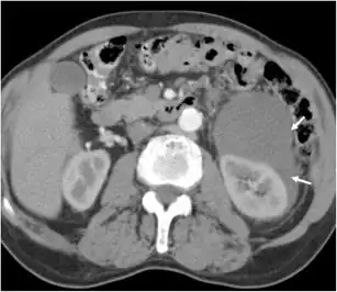 A homogenous low-density myxosarcoma arrows in the left perirenal space | |