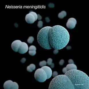 Neisseria meningitidis, often referred to as meningococcus, is a Gram-negative bacterium that can cause meningitis and other forms of meningococcal disease such as meningococcemia, a life-threatening sepsis.[1] The bacterium is referred to as a coccus because it is round, and more specifically a diplococcus because of its tendency to form pairs.