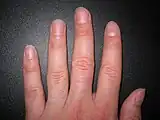 Nail growth record can show the history of recent health and physiological imbalances, and has been used as a diagnostic tool since ancient times.[20] Deep, horizontally transverse grooves known as "Beau's lines" may form across the nails (horizontal, not along the nail from cuticle to tip). These lines are usually a natural consequence of aging, although they may result from disease. Discoloration, thinning, thickening, brittleness, splitting, grooves, Mees' lines, small white spots, receded lunula, clubbing (convex), flatness, and spooning (concave) can indicate illness in other areas of the body, nutrient deficiencies, drug reaction or poisoning, or merely local injury.