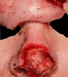 Nasal reconstruction using a paramedian forehead flap within oral and maxillofacial surgery, is a surgical technique to reconstruct different kinds of nasal defects.[1] In this operation a reconstructive surgeon uses skin from the forehead above the eyebrow and pivots it vertically to replace missing nasal tissue. Throughout history the technique has been modified and adjusted by many different surgeons and it has evolved to become a popular way of repairing nasal defects.