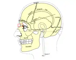 The nasion (/ˈneɪziɒn/) is the most anterior point of the frontonasal suture that joins the nasal part of the frontal bone and the nasal bones. It marks the midpoint at the intersection of the frontonasal suture with the internasal suture joining the nasal bones.[1] It is visible on the face as a distinctly depressed area directly between the eyes, just superior to the bridge of the nose. It is a cephalometric landmark that is just below the glabella.[2]
