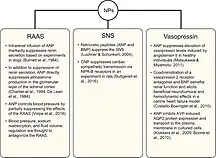 Natriuretic peptides can block the activity of the renin-angiotensin-aldosterone system (RAAS), which regulates blood pressure. Studies have shown that ANP can suppress renin secretion and aldosterone production. Additionally, natriuretic peptides suppress the sympathetic nervous system (SNS), which controls the body's "fight or flight" response.[1] The relationship between natriuretic peptides and vasopressin, a hormone that regulates water balance, has been found through studies that have shown that ANP can suppress vasopressin signaling. Researchers are working on having a better understanding of this relationship. Animal studies show the possibility of using a vasopressin receptor antagonist along with BNP to improve heart function and blood flow.[1]