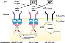 Additionally, there are three natriuretic peptide receptors: Natriuretic Peptide Receptor-A (NPR-A), Natriuretic Peptide Receptor-B (NPR-B), and Natriuretic Peptide Receptor-C (NPR-C). NPR-A and NPR-B use cyclic guanosine monophosphate (cGMP) as its intracellular messenger. NPR-A binds selectively to ANP and BNP while NPR-B binds selectively to CNP.[1] Although initially thought to have no signaling activity, NPR-C is now believed to inhibit cyclic adenosine monophosphate (cAMP) using the Giα subunit along with activating phospholipase C-β using the Giβγ subunit. The three natriuretic peptides ANP, BNP, and CNP can bind to NPR-C however it has a higher affinity towards ANP and CNP. Natriuretic peptides will lose their activity when degraded by the enzyme neprilysin which is found on the plasma membrane.[1]
