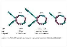A natriuretic peptide is a hormone molecule that plays a crucial role in the regulation of the cardiovascular system. These hormones were first discovered in the 1980s and were found to have very strong diuretic, natriuretic, and vasodilatory effects. There are three main types of natriuretic peptides: atrial natriuretic peptide (ANP), brain natriuretic peptide (BNP), and C-type natriuretic peptide (CNP).[1] Two minor hormones include Urodilatin (URO) which is processed in the kidney and encoded by the same gene as ANP, and Dendroaspis NP (DNP) that was discovered through isolation of the venom from the green mamba snake.[2] Since they are activated during heart failure, they are important for the protection of the heart and its tissues.[1]