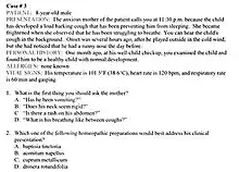 One section of this official study guide explains a clinical scenario of an after hours phone call to a naturopathic practitioner from a frantic mother with a child who has a severe cough and is gasping for air; the following example questions do not recommend that the mother take the child to the emergency department per the medical standard of care[9] but rather test on what homeopathic remedy should be administered.[10]