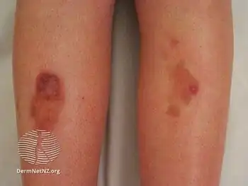 Necrobiosis lipoidica is a granulomatous skin disease.[1] It typically presents with small, firm red bumps which develop into plaques with a yellow-brown central dip and sharply defined purplish border, usually on both shins of the legs.[1][2] There may be reduced sensation and excess sweating, which gives it a shiny waxy appearance.[2] The lesion may be oval or irregular, have some scale and visible veins and can break down and ulcerate.[2]