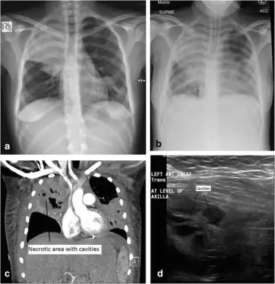 - 1 2 3 4 Sawicki, G. S.; Lu, F. L.; Valim, C.; Cleveland, R. H.; Colin, A. A. (2008-03-05). "Necrotising pneumonia is an increasingly detected complication of pneumonia in children". European Respiratory Journal. 31 (6): 1285–1291. doi:10.1183/09031936.00099807. ISSN 0903-1936. PMID 18216055.