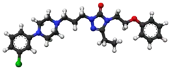 Nefazodone is metabolized in the liver, with the main enzyme involved thought to be CYP3A4.[3] The drug has at least four active metabolites, which include hydroxynefazodone, para-hydroxynefazodone, triazoledione, and meta-chlorophenylpiperazine.[2] Nefazodone has a short elimination half-life of about 2 to 4 hours.[2] Its metabolite hydroxynefazodone similarly has an elimination half-life of about 1.5 to 4 hours, whereas the elimination half-lives of triazoledione and mCPP are longer at around 18 hours and 4 to 8 hours, respectively.[2] Due to its long elimination half-life, triazole is the major metabolite and predominates in the circulation during nefazodone treatment, with plasma levels that are 4 to 10 times higher than those of nefazodone itself.[2][26] Conversely, hydroxynefazodone levels are about 40% of those of nefazodone at steady state.[2] Plasma levels of mCPP are very low at about 7% of those of nefazodone; hence, mCPP is only a minor metabolite.[2][26] mCPP is thought to be formed from nefazodone specifically by CYP2D6.[3][26]