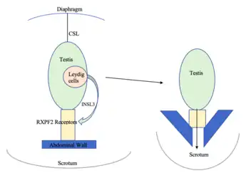 Insulin-Like Peptide 3 (INSL3) is produced by the interstitial Leydig cells located in the adult testes.[3] Leydig cells are responsible for steroidogenesis, the fetal Leydig cells differentiate during the development of the embryo. [3] They produce necessary androgens for the masculinisation of organs.[3] They also produce INSL3, which is required for the first transabdominal phase of testicular descent.[3] INSL3 acts on RXFP2 receptors which link the testis to the inguinal abdominal wall. As a result, the testes move from the inguinal canal into the scrotum.[3] Only mammals have a scrotum and descended testes.[3] INSL3 measured in amniotic fluid can therefore be a biomarker for testis development, although this period differs between species.[6]