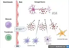 Cytokines are a class of proteins regulating inflammation, cell signaling, and various cell processes such as growth and survival.[10] Chemokines are a subset of cytokines that regulate cell migration, such as attracting immune cells to a site of infection or injury.[10] Various cell types in the brain may produce cytokines and chemokines such as microglia, astrocytes, endothelial cells, and other glial cells. Physiologically, chemokines and cytokines function as neuromodulators that regulate inflammation and development. In the healthy brain, cells secrete cytokines to produce a local inflammatory environment to recruit microglia and clear the infection or injury. However, in neuroinflammation, cells may have sustained release of cytokines and chemokines which may compromise the blood–brain barrier.[11] Peripheral immune cells are called to the site of injury via these cytokines and may now migrate across the compromised blood brain barrier into the brain. Common cytokines produced in response to brain injury include: interleukin-6 (IL-6), which is produced during astrogliosis, and interleukin-1 beta (IL-1β) and tumor necrosis factor alpha (TNF-α), which can induce neuronal cytotoxicity. Although the pro-inflammatory cytokines may cause cell death and secondary tissue damage, they are necessary to repair the damaged tissue.[12] For example, TNF-α causes neurotoxicity at early stages of neuroinflammation, but contributes to tissue growth at later stages of inflammation.