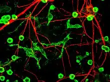 During neuropathic pain, glia become "activated" leading to the release of proteins that modulate neural activity. The activation of glia remains an area of intense interest for researchers. Microglia, the brain and spinal cord resident immune cells, respond to extrinsic cues. The source of these cues may include neurons secreting chemokines such as CCL21 and surface immobilized chemokines such as CX3CL1. Other glia such as astrocytes and oligodendrocytes may also release these extrinsic cues for microglia and microglia themselves may produce proteins that amplify the response.[28] The effect of microglia on neurons that leads to the neurons being sensitized is controversial. Brain derived neurotrophic factor, prostaglandins, TNF and IL-1β may be produced by microglia and cause changes in neurons that lead to hyperexcitability.[29][30]