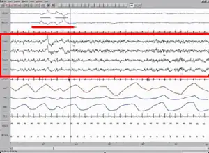 More recently, the problem of definition has been addressed by observing overall brain activity in the form of characteristic EEG patterns.[21] Each stage of sleep and wakefulness has a characteristic pattern of EEG which can be used to identify the stage of sleep. Waking is usually characterized by beta (12–30 Hz) and gamma (25–100 Hz) depending on whether there was a peaceful or stressful activity.[22] The onset of sleep involves slowing down of this frequency to the drowsiness of alpha (8–12 Hz) and finally to theta (4–10 Hz) of Stage 1 NREM sleep.[23] This frequency further decreases progressively through the higher stages of NREM and REM sleep. On the other hand, the amplitude of sleep waves is lowest during wakefulness (10–30μV) and shows a progressive increase through the various stages of sleep. Stage 2 is characterized by sleep spindles (intermittent clusters of waves at sigma frequency i.e. 12–14 Hz) and K complexes (sharp upward deflection followed by slower downward deflection). Stage 3 sleep has more sleep spindles.[24][25][26] Stage 3 has very high amplitude delta waves (0–4 Hz) and is known as slow wave sleep.[27] REM sleep is characterized by low amplitude, mixed frequency waves. A sawtooth wave pattern is often present.[28]