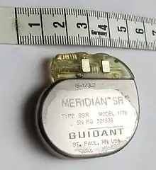 Implantable pacemakers were proposed for the first time in 1959 and became more sophisticated since then. The therapeutic application of pacemakers consists of numerous rhythm disturbances including some forms of tachycardia (too fast a heart beat), heart failure, and even stroke. Early implantable pacemakers worked only a short time and needed periodic recharging by an inductive link. These implantable pacemakers needed a pulse generator to stimulate heart muscles with a certain rate in addition to electrodes.[34] Today, modern pulse generators are programmed non-invasively by sophisticated computerized machines using RF, obtaining information about the patient's and device's status by telemetry. Also they use a single hermetically sealed lithium iodide (LiI) cell as the battery. The pacemaker circuitry includes sense amplifiers to detect the heart's intrinsic electrical signals, which are used to track heart activity, rate adaptive circuitry, which determine the need for increased or reduced pacing rate, a microprocessor, memory to store the parameters, telemetry control for communication protocol and power supplies to provide regulated voltage.[35]